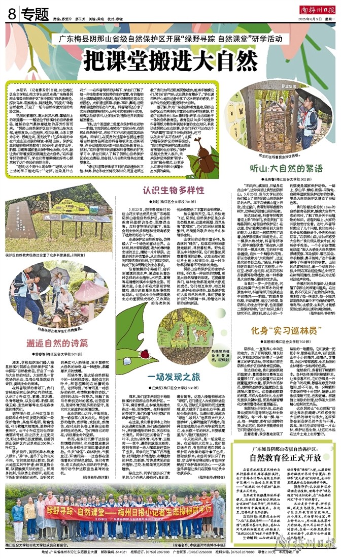 本报讯 (记者廖玉芳)日前,80位梅江区会文学校山花文学社成员走进广东梅县阴那山省级自然保护区“林中探秘”自然教育径,探访鸟类、观察昆虫、辨别植物,“沉浸式”体验自然教育,开启了一场与自然深度对话的奇妙之旅。
