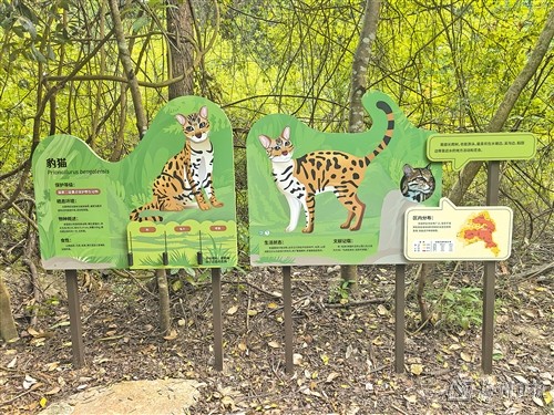 “瞧,这个是国家二级重点保护野生动物——豹猫,它在阴那山有较为广泛的分布,在阴那山自然保护区,布设了红外相机追踪其活动规律。同学们,在观赏的过程中也要注意观看自然教育径两边的科普展板和互动展项哦,许多动植物知识都可以在这条教育径上找到。”在科普导师的讲解和科普展板的扩充学习中,学生们深入了解了阴那山自然保护区的生态奥秘,体会到人与自然和谐共生的重要意义。