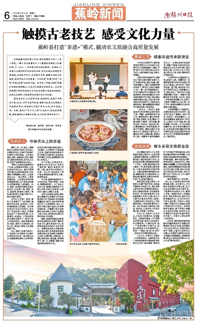 在蕉城镇市级非遗工作站、蕉岭根雕传习所——匠人部落,一群小学生拿着刨子小心翼翼地在模具上打磨木棍,不一会儿,一双双筷子就出现在眼前。在蕉岭,以非遗为主题的研学活动悄然兴起,学生们通过非遗研学游线路,在游玩中学习、在实践中传承,触摸古老技艺的温度,感受传统文化的重量。不仅仅是“非遗+研学”,还有“非遗+旅游”也悄然兴起。近年来,“非遗+旅游”的模式凭借其独特魅力,已成为文旅融合的新热点。这让那些深藏乡野的传统技艺与习俗活动得以突破地域限制,走进大众视野,为游客带来沉浸式的文化体验。