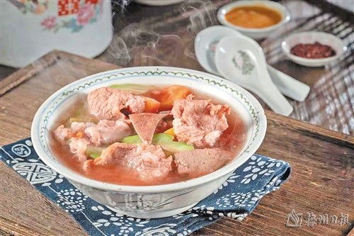 “蕉岭三及第在汤里特别加了红曲,这是蕉岭的特色,让汤色呈淡淡的红色。据《本草纲目》记载,红曲有消食祛肿、活血通络、和胃健脾之功效。红曲放进去之后,一是口感好,二是有保健功效。三及第汤选用的猪肉是猪脊顶肉,这个部位的肉瘦中夹肥微带脆,口感清甜。此外,蕉岭三及第放的青菜也是比较多的,比如萝卜青、甜菜、苦瓜、番茄等,既美味又营养。”蕉岭县非物质文化遗产保护中心副主任谢文君说。