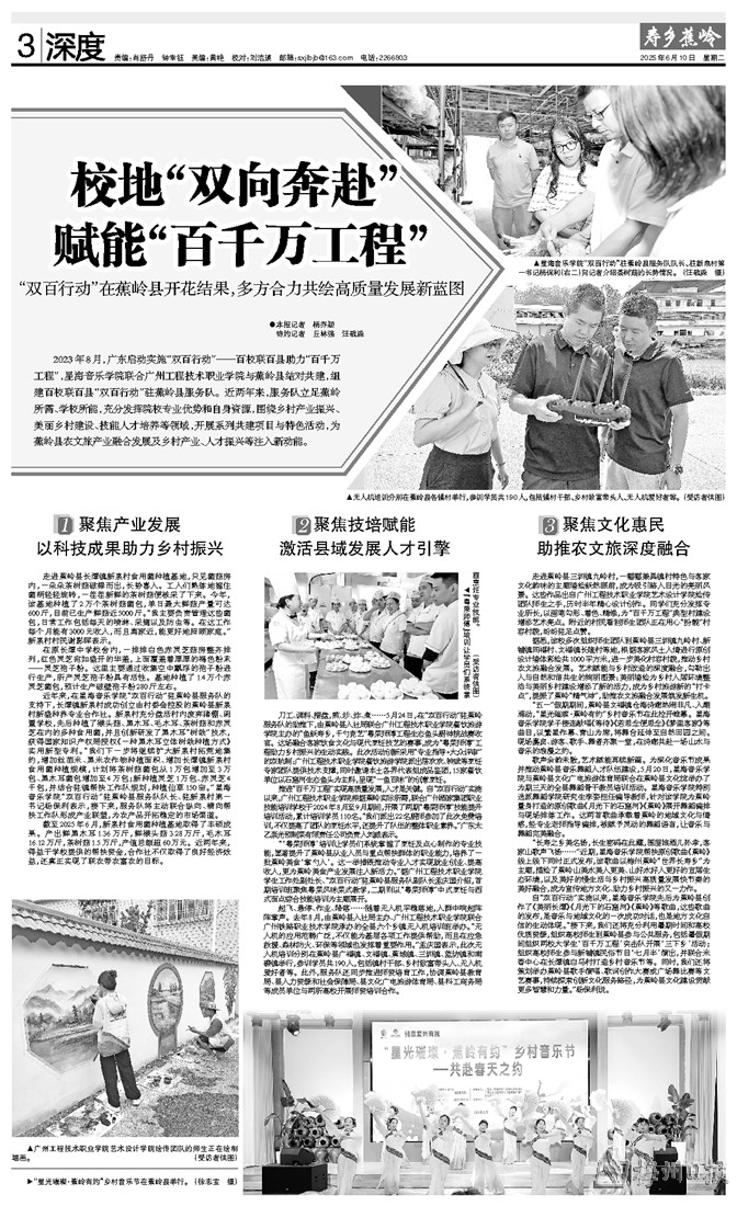 2023年8月,广东启动实施“双百行动”——百校联百县助力“百千万工程”,星海音乐学院联合广州工程技术职业学院与蕉岭县结对共建,组建百校联百县“双百行动”驻蕉岭县服务队。近两年来,服务队立足蕉岭所需、学校所能,充分发挥院校专业优势和自身资源,围绕乡村产业振兴、美丽乡村建设、技能人才培养等领域,开展系列共建项目与特色活动,为蕉岭县农文旅产业融合发展及乡村产业、人才振兴等注入新动能。