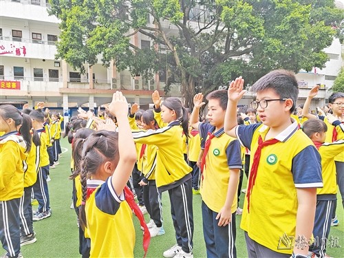 在“六一”来临之际,梅州师范学校附属小学隆重举行了“牢记党的教导 争做强国少年”一年级新队员入队仪式,为孩子们的成长篇章镌刻下庄严而温暖的记忆。 在激昂的鼓号声中,大队旗迎风飘扬,全体少先队员肃立行礼。嘹亮的《中国少年先锋队队歌》响彻操场,孩子们用歌声表达对少先队的热爱与向往。随着新队员名单的宣布,高年级队员为一年级新队员佩戴红领巾,在大队副总辅导员的带领下,新队员们高举右拳,庄严宣誓:“准备着,为共产主义事业贡献力量!”稚嫩的声音坚定有力,诠释着强国少年的担当。