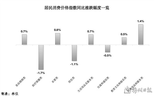分类别看,CPI八大类商品(服务)价格环比呈“4涨4降”态势。其中,衣着价格上涨0.7%,食品烟酒价格上涨0.3%,教育文化娱乐价格上涨0.2%,其他用品及服务价格上涨0.2%;交通通信价格下降1.0%,生活用品及服务价格下降0.9%,居住价格下降0.1%,医疗保健价格下降0.1%。