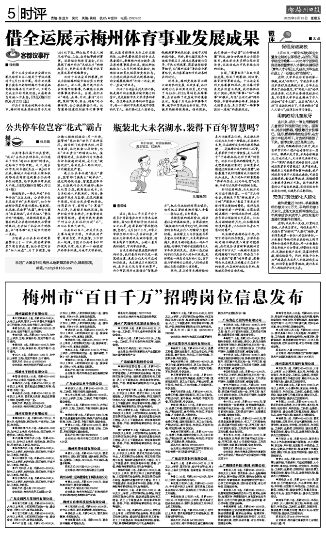 近年来,梅州竞技体育与群众体育协同发展、成效显著,不仅涌现出众多优秀运动员,更打造了马拉松、村BA等特色品牌赛事,生动诠释了这座城市的蓬勃生机。随着十五运会多项赛事开赛,城市体育设施全面升级,市民健身热情持续高涨。借此契机,我们要进一步织密“15分钟健身圈”网络,健全全民健身公共服务体系,通过举办更多群众性体育活动,让运动成为市民幸福生活的标配。