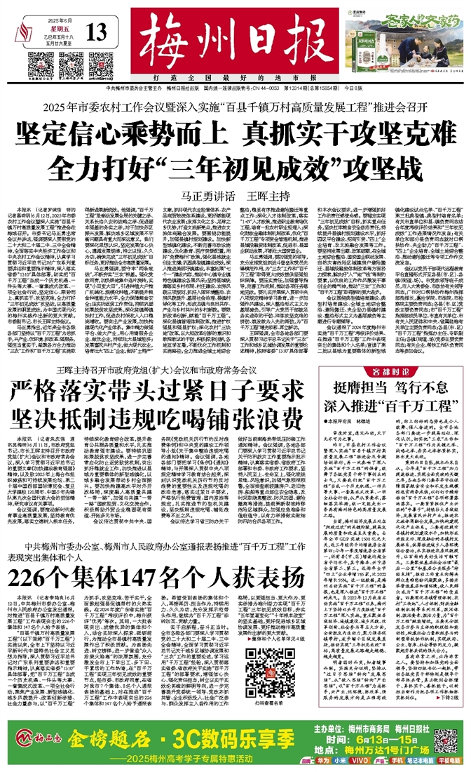 实干启新程,奋斗正当时。全市各级各部门要深入学习贯彻党的二十大和二十届二中、三中全会精神,全面学习贯彻习近平总书记关于城乡区域协调发展和“三农”工作的重要论述,学习运用“千万工程”经验,深入贯彻落实省委、省政府关于实施“百千万工程”的部署要求,增强信心决心、强化责任担当,树立以实干实效论英雄的鲜明导向,进一步完善提升党委统一领导、党政齐抓共管、企业积极投入、社会广泛参与、群众发挥主人翁作用的工作格局,以更强担当、更大作为、更实举措为梅州奋力实现“百千万工程”三年初见成效目标,夯实“五年显著变化”“十年根本改变”的坚实基础,更好促进城乡区域协调发展、更好推动梅州高质量发展作出新的更大贡献。