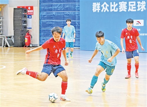 本报讯 (记者李盛华)6月15日,第十五届全国运动会群众比赛足球项目五人制男子组决赛(甲组)进行第三轮小组赛共6场比赛,广东队和香港队均迎来三连胜,携手晋级排位赛。