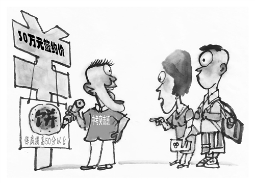 中考临近,一则“中考突击班”的广告出现在河北省保定市的多个小区电梯内。其中,“保底提高50分以上”和“30万元签约价”两项内容,吸引了部分初三学生家长的眼球。“如果孩子成绩真能提高50分以上就太好了,但是30万元的价格太贵了,简直是天价!”一名学生家长感叹道。
