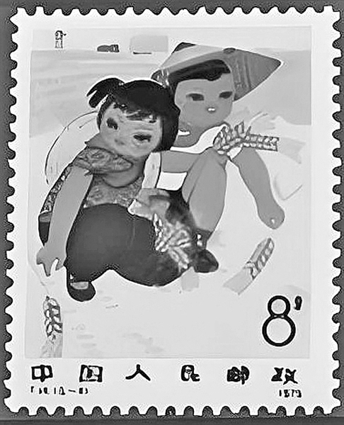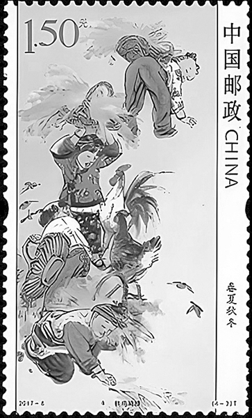 2017年3月20日,中国邮政发行的《春夏秋冬》特种邮票的第三枚“秋鸡鸣穗”(图4),以细腻的笔触描绘了一幅孩子们忙着拾稻穗的画面。孩子们脸上满是喜悦,他们忙碌的身影在金黄的稻田中显得格外生动。这枚邮票不仅展现了丰收的喜悦,更传递出一种惜粮如金的朴素情怀,体现了人们对粮食的珍视。