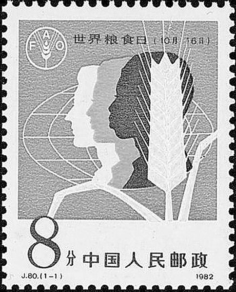 1982年10月16日,原邮电部发行的《世界粮食日》纪念邮票一套1枚(图2),其图案设计简洁而富有深意。邮票以地球为背景,上面绘有白、黄、黑三色人种头像,象征着全球人类,而环绕其间的麦穗则突出了粮食在国计民生中的重要地位。这枚邮票不仅展现了粮食对于人类生存的重要性,更提醒着人们,无论身处何地,粮食都是我们共同的宝贵资源,应当倍加珍惜。