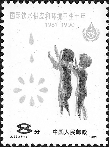 1982年3月1日,原邮电部发行的《国际饮水供应和环境卫生十年》纪念邮票(图5),以其独特的设计,传递出深刻的意义。邮票上,两名儿童双手向上伸展,仰望面前的水滴,眼神中充满了渴望。这幅画面寓意着人类对安全卫生饮水的强烈渴望,也提醒着人们要珍惜每一滴水,保护好我们的水资源。
