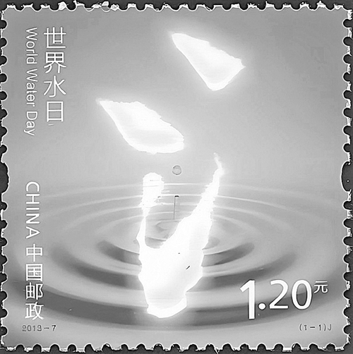 2013年3月22日,中国邮政发行的《世界水日》纪念邮票(图6),以其别具一格的设计,再次唤起了公众的节水意识。这枚邮票以蓝色为主色调,水面泛起的波纹为背景,主图为代表“水”的汉字偏旁部首“氵”。简洁而富有创意的设计,不仅展现了水的灵动与珍贵,更寓意着节约用水的重要性。它呼吁人们从自身做起,从点滴做起,珍惜水资源,保护我们的地球家园。
