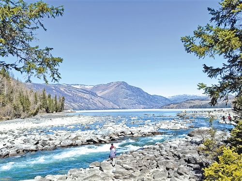 出了禾木,我们走进了神奇的喀纳斯湖景区。光秃秃的山坡,灰褐色的。一丛丛西伯利亚泰加林,如山水画里那苍劲老练的线条,勾勒在山谷沟壑之间。远处稍高的山峰,白皑皑的雪山,显得格外耀眼。群山环绕之中,一潭清澈的湖水,宁静得快要把水凝住。山峦倒映在平静的湖面之上,山脚与倒影之间,在阳光的照射下,显现出一条闪亮的分界线。在湖的出水口,灰黑色的溪石间,一泓碧玉般的湖水奔涌而出,激起的水花,像打碎的碧玉,把溪水分成乳白、粉绿和碧蓝。一股股的寒气袭来,让人亲切中多少感受到一种畏惧,柔情中带些许神秘。这也许是湖水的性情,也许是喀纳斯的精灵。雪山溶化成的湖水,是多么的清澈,多么的纯净、碧绿、冷峻、深邃。她欢快地扑进了小溪,千回百转,穿过幽深的山谷,流过宁静的林荫,滋润着沿河的花草,唱响了春天的乐章。