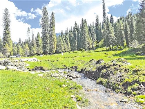 下了草原,我们汇入了河谷车流,往恰西河谷森林景点游玩。山间溪涧流水清澈,溪涧边草地上不时冒出一簇簇野生小黄花,在阳光下开得正欢,金黄灿烂,点缀在草原、绿树、溪石和流水之间,向你微笑。茂密的云杉和塔松,高低参差,如一座座墨绿的宝塔,耸立在皑皑的雪山之下。林间空气清新,凉风习习,沁人心脾,顿时消除了旅途的疲劳。犹如走进了绿野仙踪的童话世界,美不胜收。偶然蹿出的一两只小动物,吸引着人们的眼球,不时给你来个惊喜。这里的每一个角度都美到极致,让你惊叹,令人窒息。我们用手机拍下不少的美景,儿子也兴奋地拿起手机拍照,不时地摆弄着各种姿势,在美丽的景色前留影。