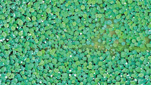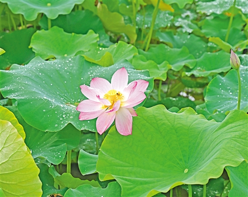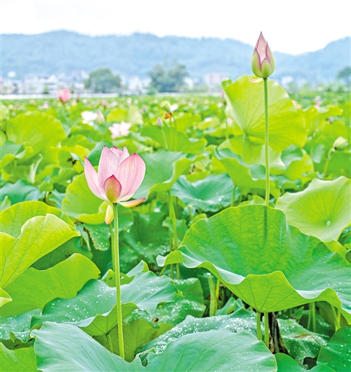 在大柘镇杞园村车上村民小组,100余亩荷塘翠叶翻涌成浪,粉白花朵星罗棋布。粉白相间的荷花或含苞待放、或亭亭玉立,与远处青山、近处稻田相映成趣。