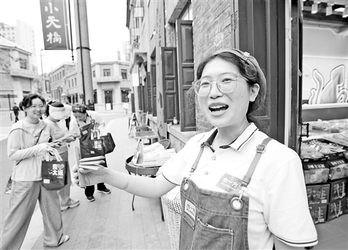在大连东关街历史文化街区,一名售货员以快板的方式推销美食商品。