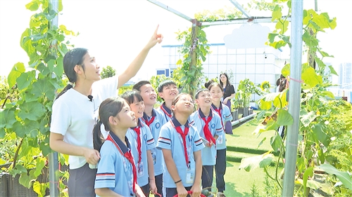 走进该校楼顶劳动实践基地,由21个班级共同打造的百果园、百蔬园生机盎然。昔日空旷的楼顶已种满各类蔬果,西红柿、番薯叶、南瓜、向日葵等品种繁多。辅导员在此为少先队员详细讲解蔬菜种植知识,不少队员在绿意中写生,雅致十足。更多队员则在辅导员带领下投入果蔬管理,翻土、浇水、施肥、采摘,大家热情高涨、分工明确。