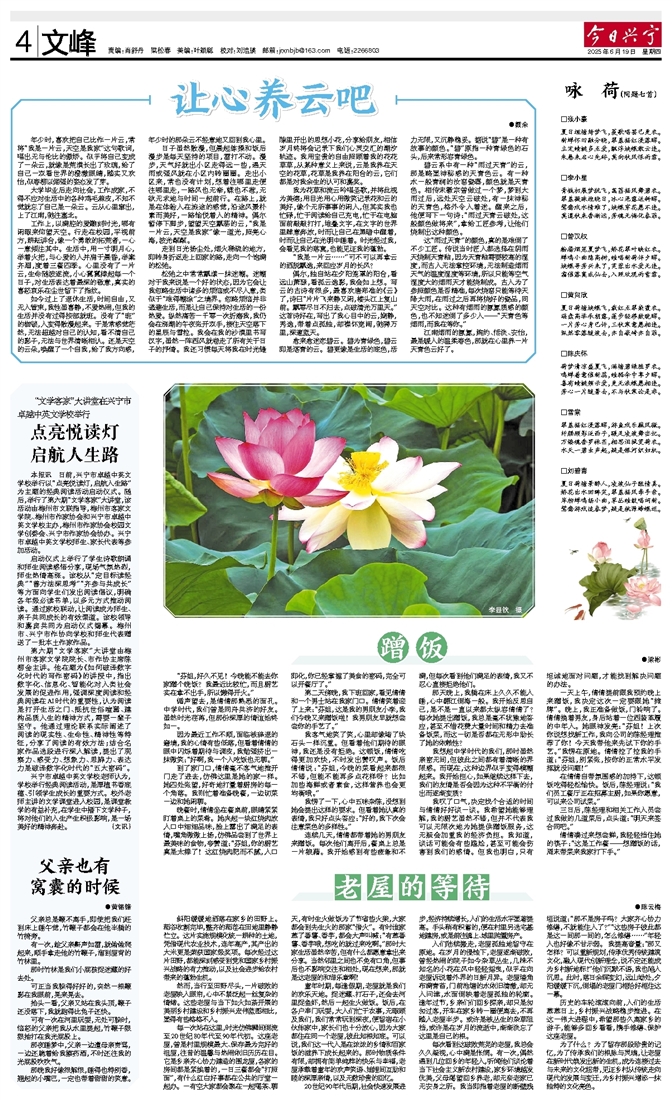 工作上,以满腔的爱雕刻时光,哪有闲暇来仰望天空。行走在校园,平视前方,耕耘讲台,像一个勇敢的拓荒者,一心一意倾注其中。生活中,用一寸明月心,举着火把,与心爱的人并肩于晨昏,举案齐眉,度着三餐四季。心里没有了一片云,生命随波逐流,小心翼翼捧起每一个日子,对生活表达着最深的敬意,真实的喜怒哀乐在尘世留下了指纹。