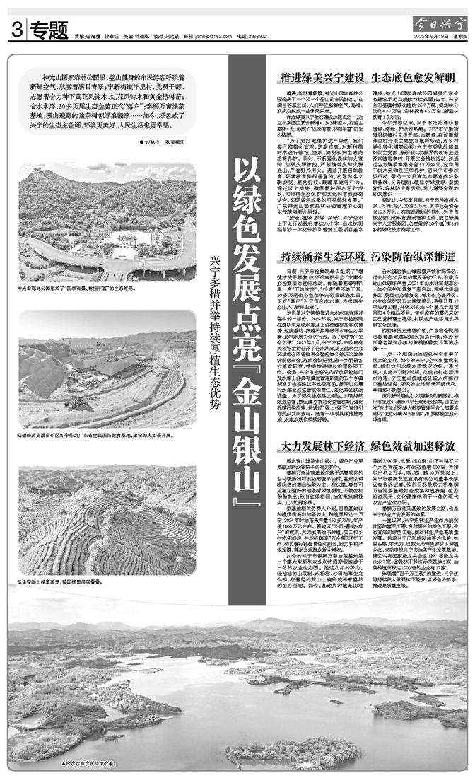 神光山国家森林公园里,登山健身的市民游客呼吸着新鲜空气,欣赏着满目青翠;宁新街道洋里村,党员干部、志愿者合力种下黄花风铃木、红花风铃木和黄金榕树苗;合水水库,30多万尾生态鱼苗正式“落户”;泰狮万亩油茶基地,漫山遍野的油茶树似绿浪翻滚……如今,绿色成了兴宁的生态主色调,环境更美好,人民生活也更幸福。