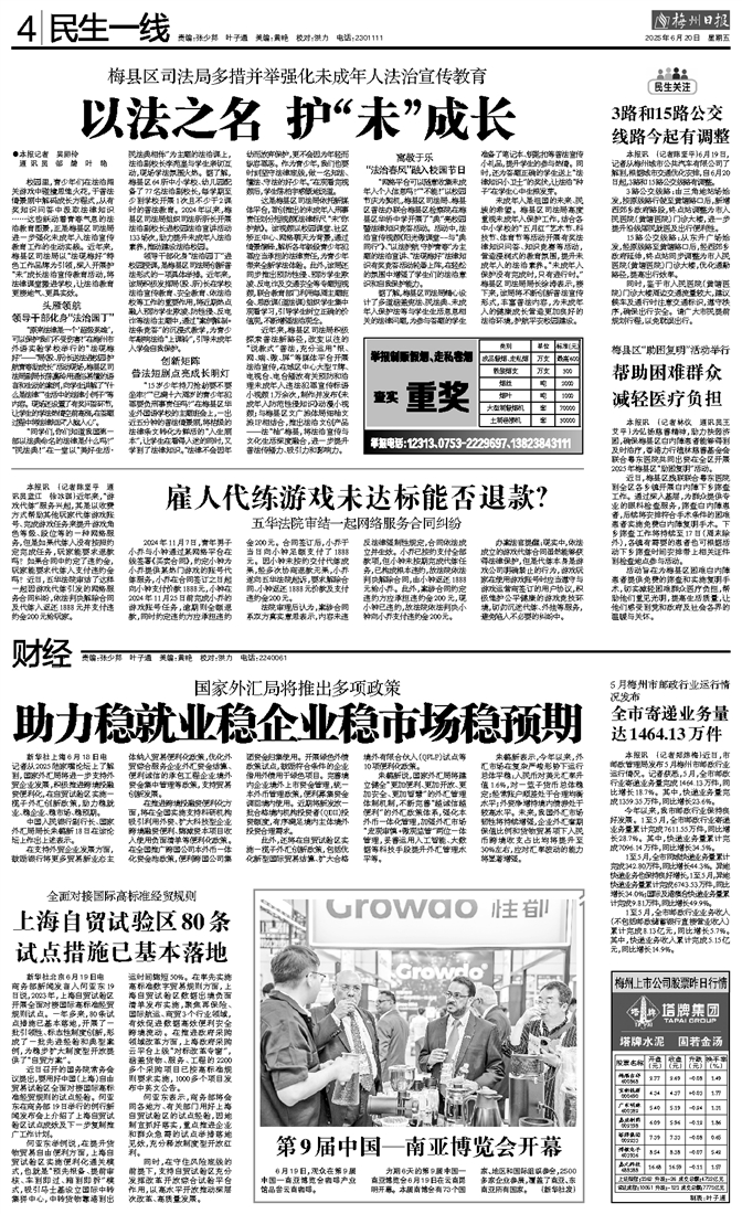 未成年人是祖国的未来、民族的希望。梅县区司法局高度重视未成年人保护工作,结合各中小学校的“五月红”艺术节、科技节、体育节等活动开展有奖法律知识问答、知识竞赛等活动,营造浸润式的教育氛围,提升未成年人的法治素养。“未成年人保护没有完成时,只有进行时。”梅县区司法局局长徐涛表示,接下来,该局将不断创新普法宣传形式,丰富普法内容,为未成年人的健康成长营造更加良好的法治环境,护航平安校园建设。