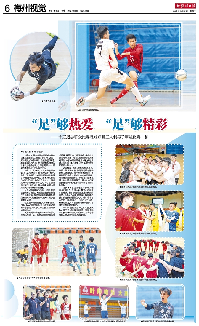 6月13日至19日,12支来自全国各省(市、区)的球队齐聚“足球之乡”梅州,向十五运会群众比赛足球项目五人制男子甲组冠军发起冲击。参赛球员都是“00后”,不少还是在校大学生。一群对足球“足”够热爱的年轻人,为了各自的足球梦想,在球场上奋力拼搏,给观众带来30场“足”够精彩的比赛。