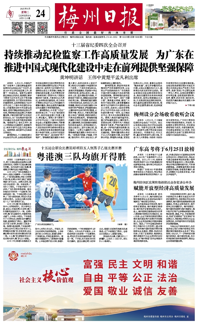 本报讯 (记者李盛华)6月23日,第十五届全国运动会群众比赛足球项目五人制男子乙组比赛在梅州开赛。当天共进行6场小组赛,粤港澳三队携手出战,均旗开得胜。