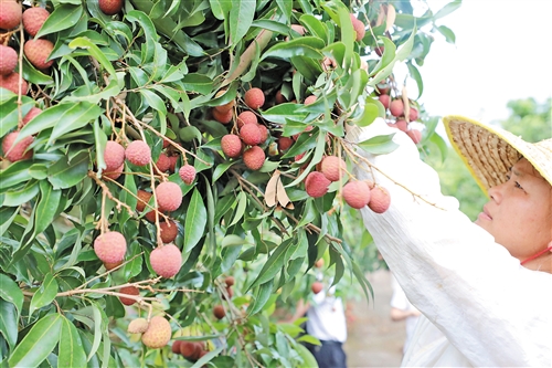 本报讯 (记者赖锋 特约记者周扬 曾文敏)夏至时节,五华县益塘水库周边的万亩荔枝迎来成熟上市高峰期,连片的荔枝林绿浪翻滚,一串串圆润饱满的荔枝压弯枝头,空气中弥漫着丰收的甜蜜和喜悦。
