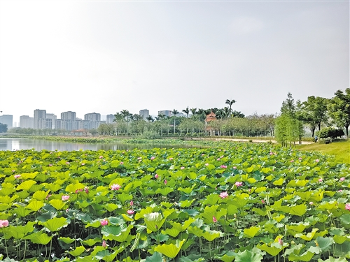 梅州城区剑英公园里,大片荷花盛开。(罗颂平 摄)