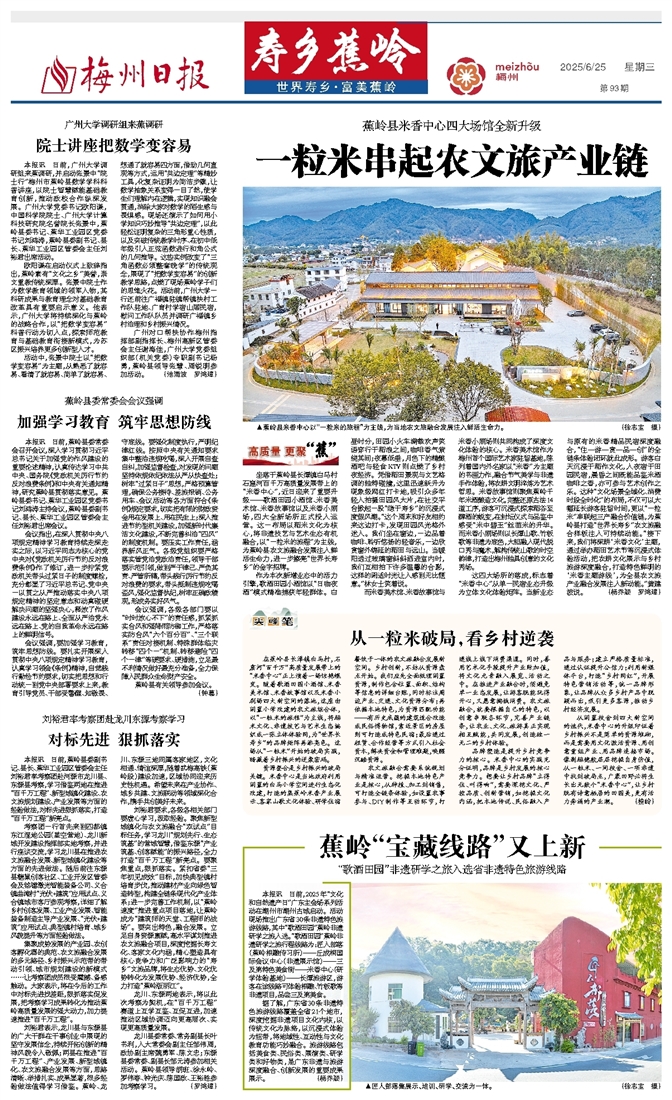刘裕君要求,各级各相关部门要虚心学习,汲取经验。聚焦新型城镇化与农文旅融合“双试点”目标任务,学习龙川“规划先行、生态筑基”的营城智慧,借鉴东源“产业筑基、创客赋能”的振兴路径,全力打造“百千万工程”新亮点。要聚焦重点,狠抓落实。紧扣省委“三年初见成效”目标,加快典型镇村培育步伐,推动建材产业向绿色智造转型,构建全链条现代化产业体系;进一步完善工作机制,以“蕉岭速度”推进重点项目落地,让蕉岭成为“建筑师的天堂、工程师的战场”。要突出特色,融合发展。立足自身资源禀赋,高水平谋划推进农文旅融合项目,深度挖掘长寿文化、客家文化内涵,精心塑造具有核心竞争力和广泛影响力的“寿乡”文旅品牌,将生态优势、文化优势转化为发展优势、经济优势,全力打造“蕉岭版丽江”。