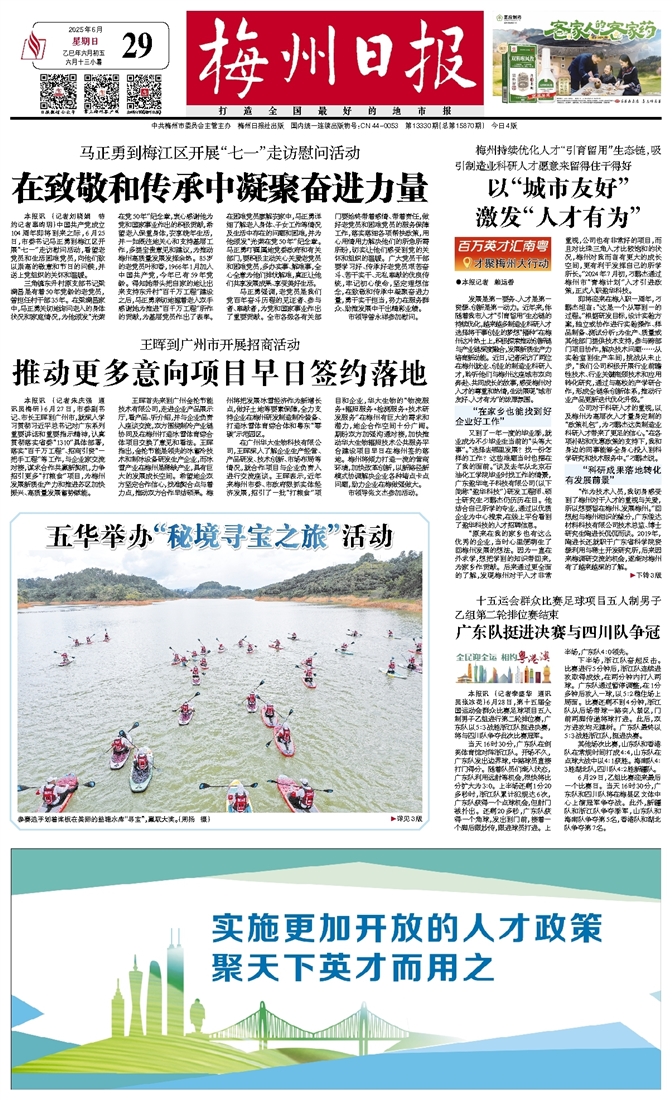 本报讯 (记者朱庆强 通讯员梅研)6月27日,市委副书记、市长王晖到广州市,就深入学习贯彻习近平总书记对广东系列重要讲话和重要指示精神,认真贯彻落实省委“1310”具体部署,落实“百千万工程”、招商引资“一把手工程”等工作,与企业家交流对接,谋求合作共赢新契机,力争招引更多“打粮食”项目,为梅州发展新质生产力和推进苏区加快振兴、高质量发展蓄势赋能。