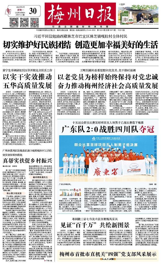 当天16时30分,决赛在梅县区文体中心进行。比赛开场2分多钟,广东队球员成功抢断,两脚传递后在对方密集防守中起脚打门,取得1∶0领先。破局后的广东队放开手脚,球员还上演高难度的倒勾射门动作,技惊四座。上半场比赛还剩5分钟左右,广东队获得一个角球,发出后接应球员直接打门,把比分改写为2∶0。