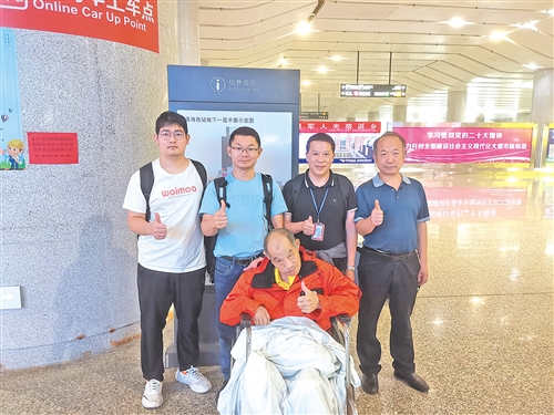 2024年9月,救助站接到市人民医院通报,一名昏迷滞留的老年患者经治疗可以出院。党员护送小组闻令而动,摸清老人情况,积极对接天津市救助机构,跨越2000公里,成功护送流浪30余年的“轮椅老伯”安全平安返乡,用实际行动诠释责任与担当。