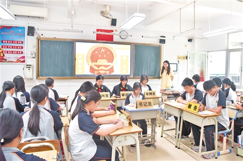 “现在请审判长、审判员入庭,全体起立……”随着“审判长”敲下庄严的法槌,“模拟法庭”活动正式开始。学生分别饰演审判长、审判员、书记员等。