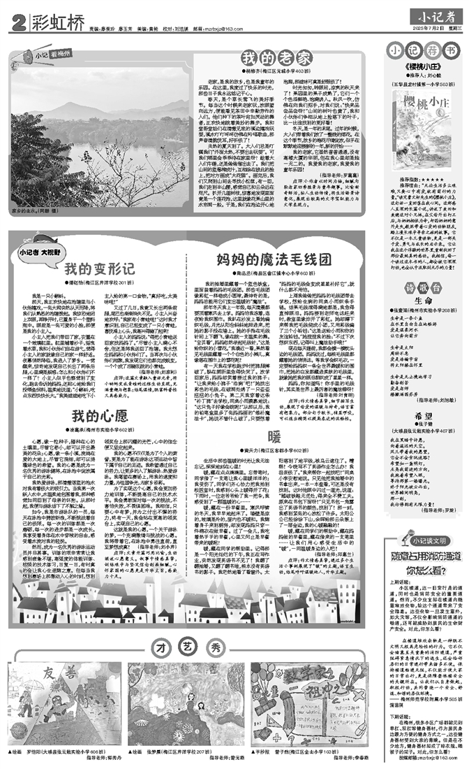 点评:小作者以时间为轴,细腻勾勒老家四季胜景与童年趣事。比喻新奇鲜活,拟人生动传情,将生活场景诗意化,展现出较高的文字驾驭能力与文学表现力。