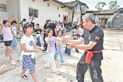 刚踏入围屋,朱家教拳法传承人罗玉祥师傅及其弟子等人早已等候多时。“孩子们,看好咯!”罗师傅一套拳法虎虎生风,刚劲有力,引得小记者们纷纷围拢模仿。“出拳要稳,手臂伸直,注意发力点。”罗师傅一边纠正着小记者们的动作,一边叮嘱道。小记者们的动作略显稚嫩,但学得格外认真,一招一式间,感受着传统武术的独特魅力。