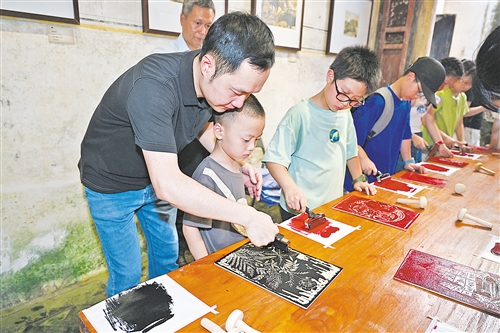 这里还被打造成版画创作实践基地,我们在这里体验了版画制作。我们先选择一种图案,将纸张覆盖在木板上,然后拿起刷子,将准备好的彩漆刷上去,最后用蘑菇拓印出来,一幅美丽的版画就问世了。听讲解员说,版画还是非物质文化遗产呢。