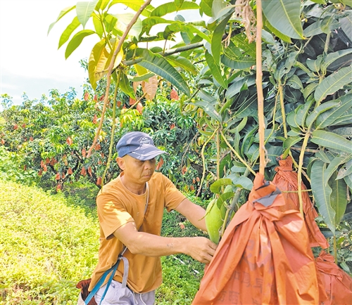 万亿果场位于河东镇黄湖村英特泰,占地面积40多亩,是当地规模较大的芒果种植基地之一。记者看到,芒果树郁郁葱葱、一颗颗套着防虫袋、沉甸甸的金煌芒挂满枝头,果香四溢。这些金煌芒被白色果袋包裹着,既有效防止了病虫害的侵袭,又保证了果实的品质。果场负责人刘晓丽夫妇拿着剪刀和锄头穿梭果树间,仔细查看芒果的成熟情况,为即将到来的采摘季做准备。