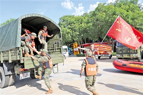 当天,在梅州军分区和各县(市、区)人武部营院内,梅州军分区全体官兵和市、县两级民兵应急分队指战员身着救生衣整齐列队,大型桥车、运输车、冲锋舟、橡皮艇等防汛抢险装备集结列阵,吹响梅州民兵防汛抢险演练“集结号”。