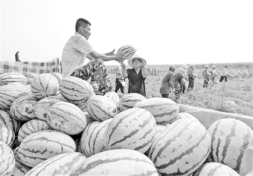 7月9日,河北省唐山市丰南区东田庄镇大吴庄户村的农民在田间收获西瓜。