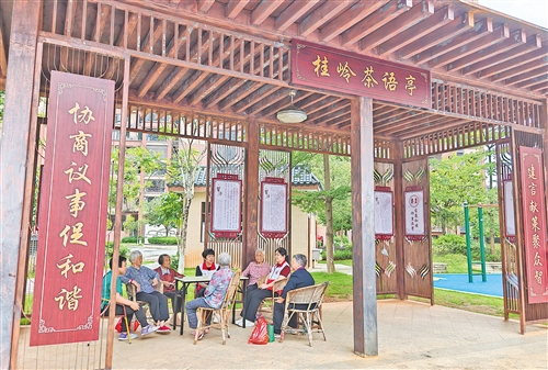 “我们组建了由‘镇干部+社区干部+物业负责人+小区业主代表’为成员的议事团,议事团每月固定日期齐聚‘议事亭’召开邻里恳谈会,构建‘群众点单—物业接单—多方议事—合力实施’小区自治链。”宝利园党支部负责人钟依秀介绍说,社区还邀请小区有丰富群众工作经验、处事公平公正的老干部、老党员以及驻社区律师等加强与小区物业联动,协助将矛盾纠纷化解在萌芽状态,让小区居民实现“小事亭内议、大事亭内决”。