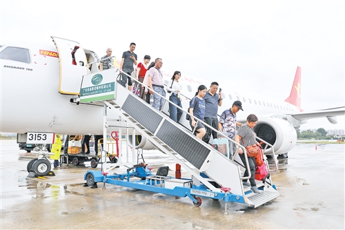 本报讯 (记者郑炜梅)7月10日13时30分,天津航空GS6565航班E190客机平稳降落在梅州机场,标志着海口⇌梅州⇌武汉航线正式开航。自此,梅州机场共通航北京、广州、长沙、杭州、海口、武汉等6个城市。