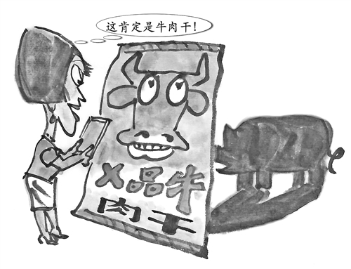 湖北武汉市赵女士日前在一家商店购买了“一品牛肉干”。回家仔细一看才发现,肉干不是牛肉,而是猪肉制品,“一品牛”实为商标。近年来,一些生产企业玩起商标的“文字游戏”,打“擦边球”,引起消费者质疑。王成喜/图