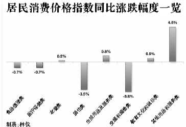 分类别看,CPI八大类商品(服务)价格环比呈“1涨1平6降”态势。其中,其他用品及服务价格上涨0.8%;生活用品及服务价格持平;居住价格下降0.8%,交通通信价格下降0.3%,食品烟酒价格下降0.3%,教育文化娱乐价格下降0.2%,衣着价格下降0.1%,医疗保健价格下降0.1%。
