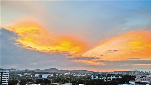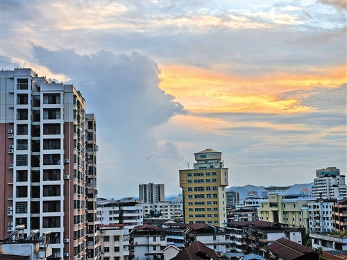 天台托着最先落纸的云团,一团像攥紧的拳头悬在小区楼宇上,指节分明地抵着蓝天;忽然手指松开,化作慢悠悠爬行的蜗牛,壳上的螺纹转着转着,蹭过天台的积水洼,漾开一圈圈云影。风来的时候最热闹,一道云絮突然绷直了身子,成了穿梭在楼宇间的贪吃蛇,鳞片擦过空调外机,又猛地舒展翅膀——是展翅的大鹏,翼尖扫过路灯柱,转瞬又收拢,幻作尾羽拖曳的凤凰,金辉缭绕天际。骤雨前,云团乌泱泱地压在高楼之上,铅灰色的块垒沉向河面,暴雨从局部倾泻而下。雨云团身后,阳光仍携着彩云在天空雀跃。