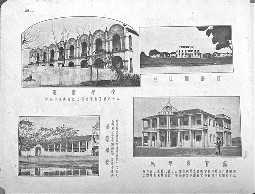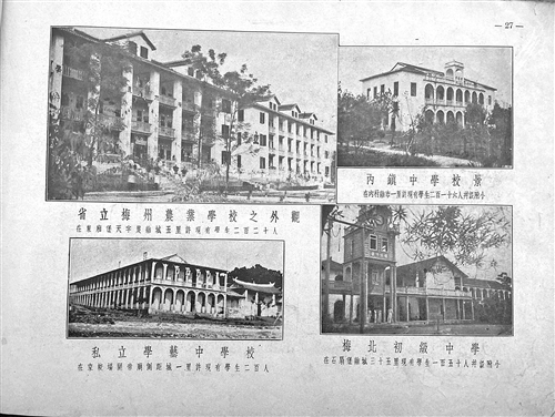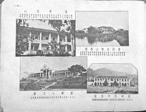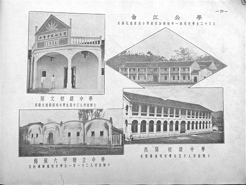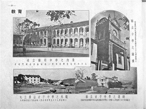 省立梅州中学之内景(在北门岗北仓,离城约1里,现有学生760人)、县立中学之钟楼(在南门内孔庙,现有学生420人,并设附小)、私立广益女子中学之外观(在东厢堡挖子里,离城6里许,现有学生60人,并设附小)、县立女子中学之远眺(在城内城隍庙侧,即原日培风书院,现有学生108人,并设附小,已改为省立)、省立梅州农业学校之外观(在东厢堡天字岃,离城5里许,现有学生220人)、私立学艺中学校(在东较场关帝庙侧,距城1里许,现有学生200人)、丙镇中学校景(在丙村离市1里许,现有学生216人并设附小。编者注:市,应是指墟市、墟镇)、梅北初级中学(在石扇堡,离城35里,现有学生150人,并设附小)、私立广益中学之外观(在东门外,为中美人士所合办高中,业已准案,现有学生280人,并设附小)、私立东山中学校(在东山角状元桥侧,离城3里许,现有学生610人,并设附小)、松口初级中学校(在松口,离市1里许,现有学生338人,并设附小)、私立乐育中学之纪念亭(在西厢堡黄塘约,外国语用德文教授,现有学生340人,并设附小)、隆文初级中学(在隆文墟对面,现有学生53人,并设附小)、畲江公学(在畲坑墟,原为小学,最近加办初中一班,现有学生23人)、梅蕉六甲联立中学(在松源新墟,现有学生112人,并设附小)、西阳初级中学(在西阳墟,现有学生58人,并设附小)、心光学校(在西厢黄塘,民国元年为德人所创办,专收一般盲女授以生活技能,现改由中德合办,学生62人,全年经费6000余元)、西街小学校校景(在西街瓜子园,校舍由该校长黄文英出洋募款建筑而成,现有学生248人,原校舍不敷分配,业已兴工扩建)、会文小学校(在西厢堡曾龙岃,离城6里许,现有学生318人)、黄坊平民学校(在西阳黄坊,仅办初级,专收一般平民子弟入学,现有学生180人)、城内公学校(在井头街,现有学生818人)、绍洲小学校(在东厢堡大塘面,离城8里许,现有学生165人)、桂里小学之内景(在东街攀桂坊,离城1里许,现有学生354人)、西厢公学校(在西厢堡五里亭侧,离城5里许,现有学生323人)、溪南学校(在松口溪南梅江上,现有学生560人)、黄寨学校(在西厢此君亭侧,离城3里,校舍系向南洋华侨募款所建,现有学生200人),另有松口图书馆、民众教育馆(在公共体育场即原东较场,于民国二十三年建筑完成,内设问字处、图书馆、阅览室等,新馆现移体育场外,右侧建筑业已兴工)。