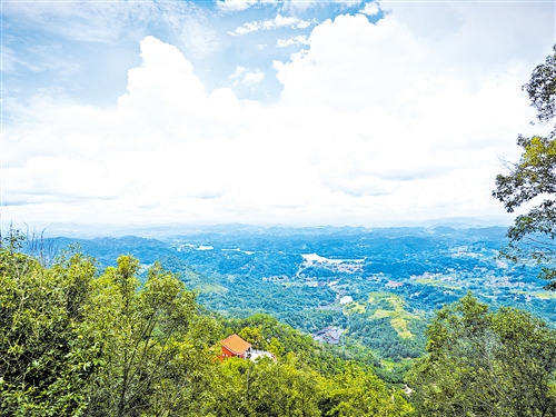 闲聊中的阿嫂热情招呼我们喝茶,心有余悸的我正好喝喝茶压压惊。喝茶聊天中,我们了解到所在的尖石笔位于大坪镇与南口镇交界的山峰,海拔638米,分矮笔与高笔,高矮相差约150米。我们喝茶的地方是矮笔,那端坐山间的即是矮笔禅寺,这里有停车场、卫生间、接待室等配套设施。
