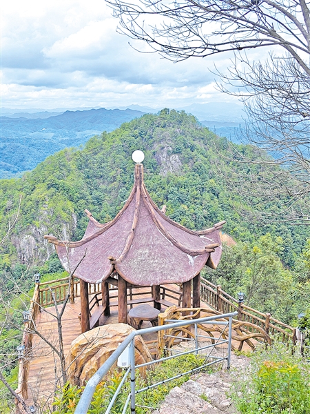 我有点怵于登高,但热情的阿嫂说登上高笔才十来分钟,来到尖石笔,岂能不登高。几百级的石阶云梯,真的很陡,所幸钢管护栏很结实,攀爬也没那么累。半山处,有一六角观景亭,围栏、石桌、石凳、歇脚、纳凉、观景,真乃尖石笔赏心悦目绝佳处。抬头看,离峰顶还有不是太远的距离,随形山石凿出的台阶不是那么平整,依然有护栏相佐,此处拍照视野极佳,远处层峦叠嶂苍茫辽阔,两旁野花野草葳蕤茂盛,花香沁人。