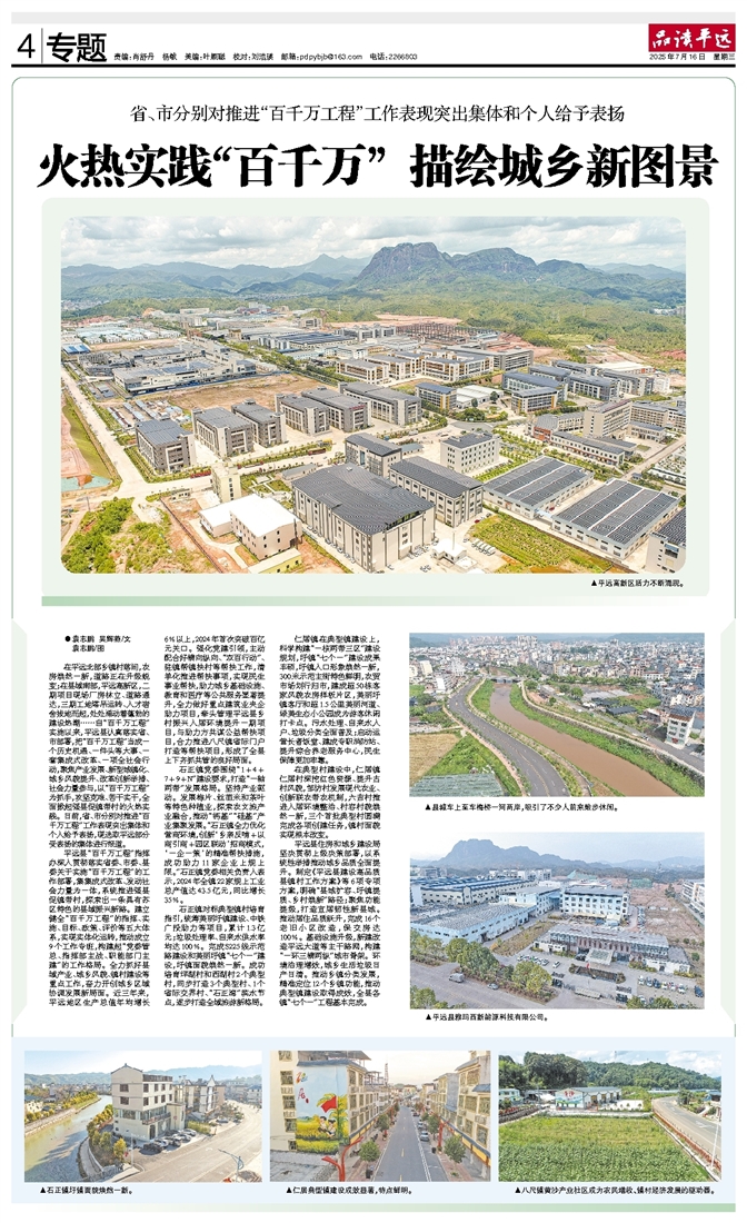 在平远北部乡镇村落间,农房焕然一新,道路正在升级蜕变;在县域南部,平远高新区,二期项目现场厂房林立、道路通达,三期工地塔吊运转、人才宿舍拔地而起,处处涌动着蓬勃的建设热潮……自“百千万工程”实施以来,平远县认真落实省、市部署,把“百千万工程”当成一个历史机遇、一件头等大事、一套集成式改革、一项全社会行动,聚焦产业发展、新型城镇化、城乡风貌提升、改革创新举措、社会力量参与,以“百千万工程”为抓手,攻坚克难、苦干实干,全面掀起强县促镇带村的火热实践。日前,省、市分别对推进“百千万工程”工作表现突出集体和个人给予表扬,现选取平远部分受表扬的集体进行报道。