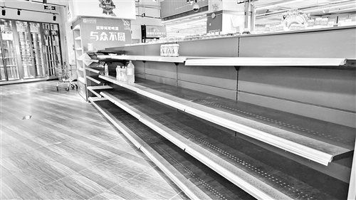 走进超市,记者看到,前来购物的市民有不少,货架上的商品较为充足,超市内的好些商品进行了打折促销,跟平时运营情况差不多,但部分清空的货架已经没有再补货。