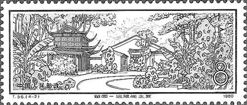 1980年10月25日,原邮电部发行的《苏州园林——留园》特种邮票的第2枚“远翠阁之夏”,邮票画面中,夏日的花草树木掩映着远翠阁,周围玲珑的太湖石旁,几株繁茂的芭蕉随风摇曳,绿树环抱间曲径通幽,为夏日的远翠阁增添了几许清凉之意。