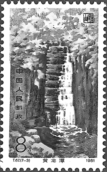 1981年7月20日,原邮电部发行的《庐山风景》特种邮票的第3枚“黄龙潭”,设计者采用竖式票幅,让飞瀑从悬崖之上倾泻而下,直落碧绿的潭中,激起阵阵水花,蔚为壮观。潭在两山之间,山崖上青藤覆盖,阳光从绿叶的缝隙间透出,岩壁上长满青苔,谷深景暗,即使盛暑身临此地,也觉寒气逼人。